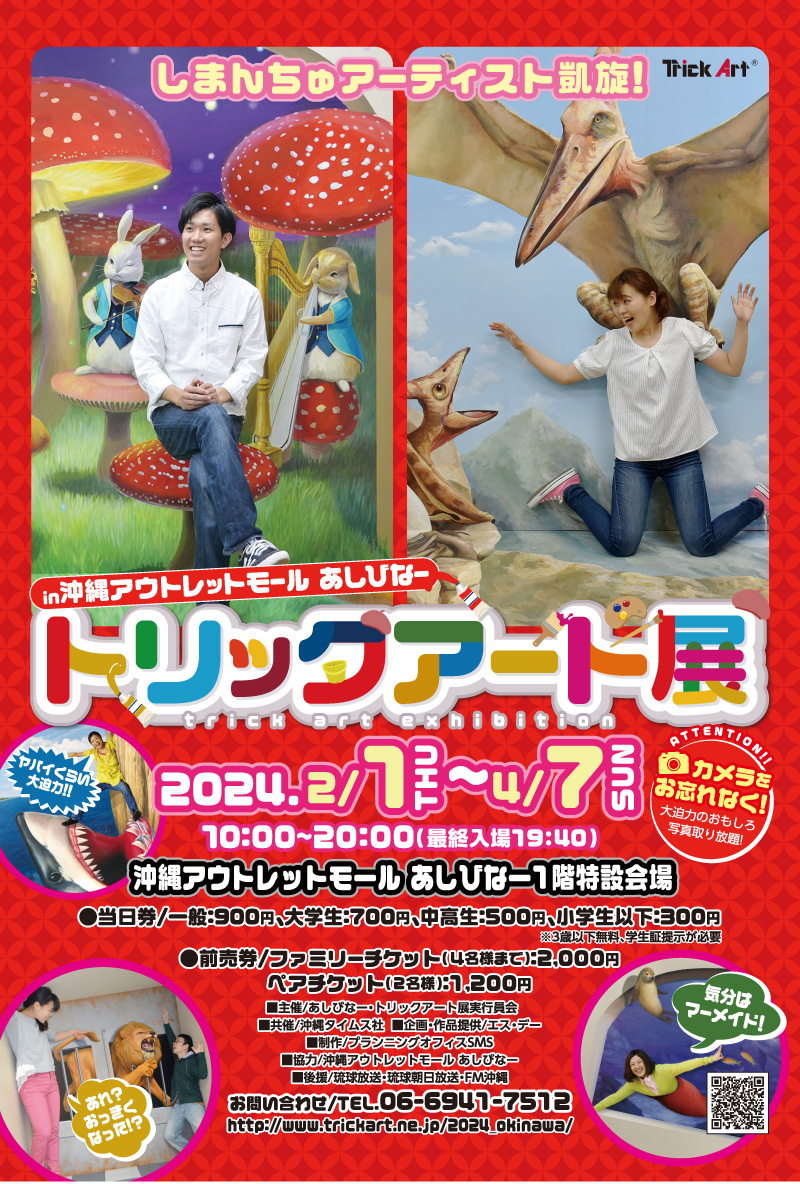 流通豊見城市トリックアート展沖縄アウトレットモールあしびなー 当日券一般:900円/大学生:700円/中高生:500円/小学生以下:300円 ※3歳以下無料、学生証提示が必要前売券ファミリーチケット(4名様まで):2,000円 ペアチケット(2名様):1,200円お問い合せTEL:06-6941-7512導入事例 不動産 サンプル事例4職業名サンプル名前